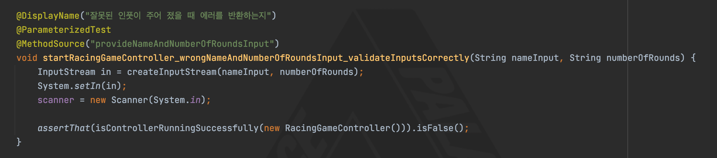 우선 provideNameAndNumberOfRoundsInput 메서드를 통해 MethodSource 테스트 케이스를 제공해준다. 각 Argument의 첫 번째 인자는 자동차 이름 (첫번째 사용자 input)이고 두 번째 인자는 라운드 횟수 (두번째 사용자 input)이다.